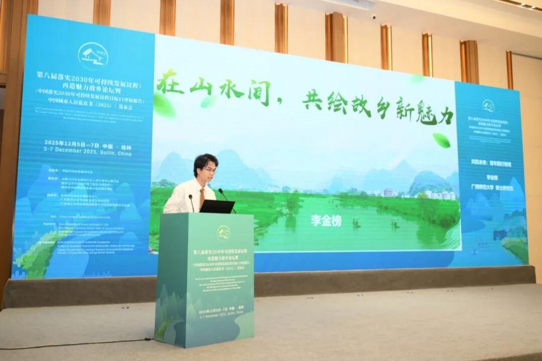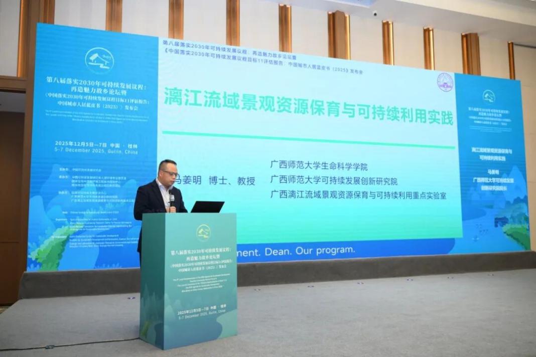 2025年12月6日,由中国可持续发展研究会主办,中国可持续发展研究会人居环境专业委员会、国家住宅与居住环境工程技术研究中心和桂林市国家可持续发展议程创新示范区承办,桂林市可持续发展促进中心、广西师范大学可持续发展创新研究院(以下简称“研究院”)和广西漓江流域景观资源保育与可持续利用重点实验室(以下简称“重点实验室”)协办的第八届落实 2030 年可持续发展议程:再造魅力故乡论坛暨《中国落实 2030 年可持续发展议程目标 11 评估报告:中国城市人居蓝皮书(2025)》发布会在桂林市成功举办。本次大会围绕可持续发展目标落实、人居环境提升、科技创新赋能等核心议题展开深度交流,汇聚了来自国际机构、社会团体、政府部门、科研院所、高校和企业的 100 余名中外代表参加了本次论坛。