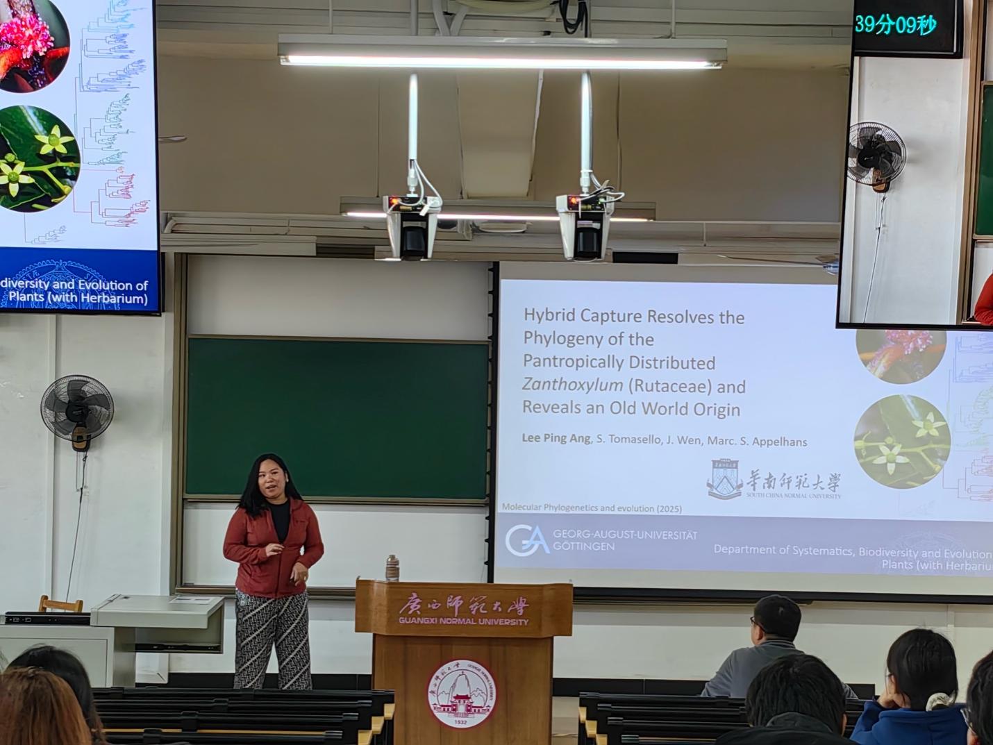 2025年12月1日,德国马尔堡大学尹相博副研究员和华南师范大学Lee Ping Ang特聘研究员应邀到广西漓江流域景观资源保育与可持续利用重点实验室(以下简称“重点实验室”)作学术报告,题目分别为“场区外生态影响”和“Hybrid Capture Resolves the Phylogeny of the Pantropically Distributed Zanthoxylum (Rutaceae) and Reveals an Old World Origin”。报告由重点实验室母艳梅博士主持,重点实验室师生40余人参加。