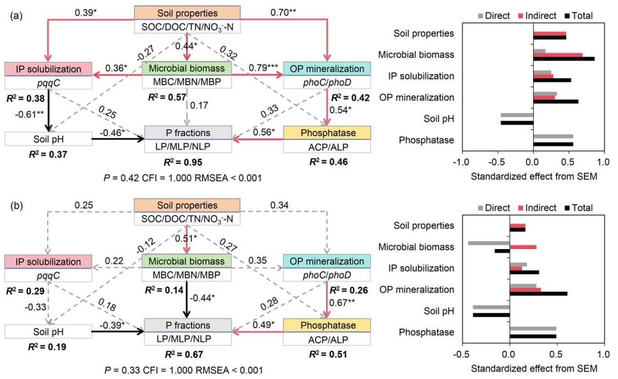 豆科植物能够改善土壤氮素状况,但其如何影响土壤磷循环仍缺乏系统研究。尤其是在磷匮乏的喀斯特生态系统中,豆科植物影响土壤磷转化过程的微生物机制还不清楚。本研究以中国西南亚热带喀斯特生态系统为对象,选取4种本地优势豆科植物和4种非豆科植物(包括灌木和小乔木),测定根际土壤磷库和磷组分以及微生物生物量、磷酸酶活性、磷循环微生物群落和关键功能基因(pqqC、phoC、phoD和phnK)丰度,探究豆科植物如何通过根际微生物属性调控土壤磷转化过程。结果表明,豆科植物根际土壤中全磷和有效磷含量显著高于非豆科植物,具体表现在土壤中树脂提取态磷(resin-P)和碳酸氢钠提取无机磷(NaHCO3-Pi)以及残留态磷(residual-P)的增加。磷有效性的提高与pqqC、phoC、phoD和phnK基因丰度增加密切相关,这些基因通过调节土壤pH并增强酸性和碱性磷酸酶活性,间接促进了无机磷溶解和氢氧化钠提取有机磷(NaOH-Po)的矿化。相比之下,非豆科植物根际土壤的微生物与磷转化速率之间关联较弱。综上所述,本研究揭示了豆科植物调控土壤磷循环的微生物机制,为养分匮乏的喀斯特生态系统中植被恢复提供了理论支撑。