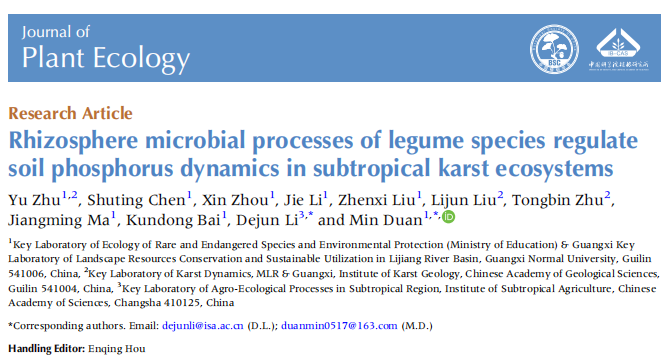 相关成果以“Rhizosphere microbial processes of legume species regulate soil phosphorus dynamics in subtropical karst ecosystems”为题,正式发表于环境科学与生态学领域期刊《Journal of Plant Ecology》(中科院一区Top,2025年升级版)。广西漓江流域景观资源保育与可持续利用重点实验室(以下简称“重点实验室”)2022级林业硕士研究生朱雨为论文第一作者,重点实验室段敏副教授与中国科学院亚热带农业生态研究所李德军研究员为共同通讯作者,马姜明教授、白坤栋研究员、中国地质科学院岩溶地质研究所朱同彬研究员也参与了该研究工作。该研究获国家自然科学基金地区基金(42467047,42067023)、珍稀濒危动植物生态与环境保护教育部重点实验室主任基金(ERESEP2020Z01)、广西漓江流域景观资源保育与可持续利用重点实验室开放基金(LRCSU21Z0208)等项目的共同资助。