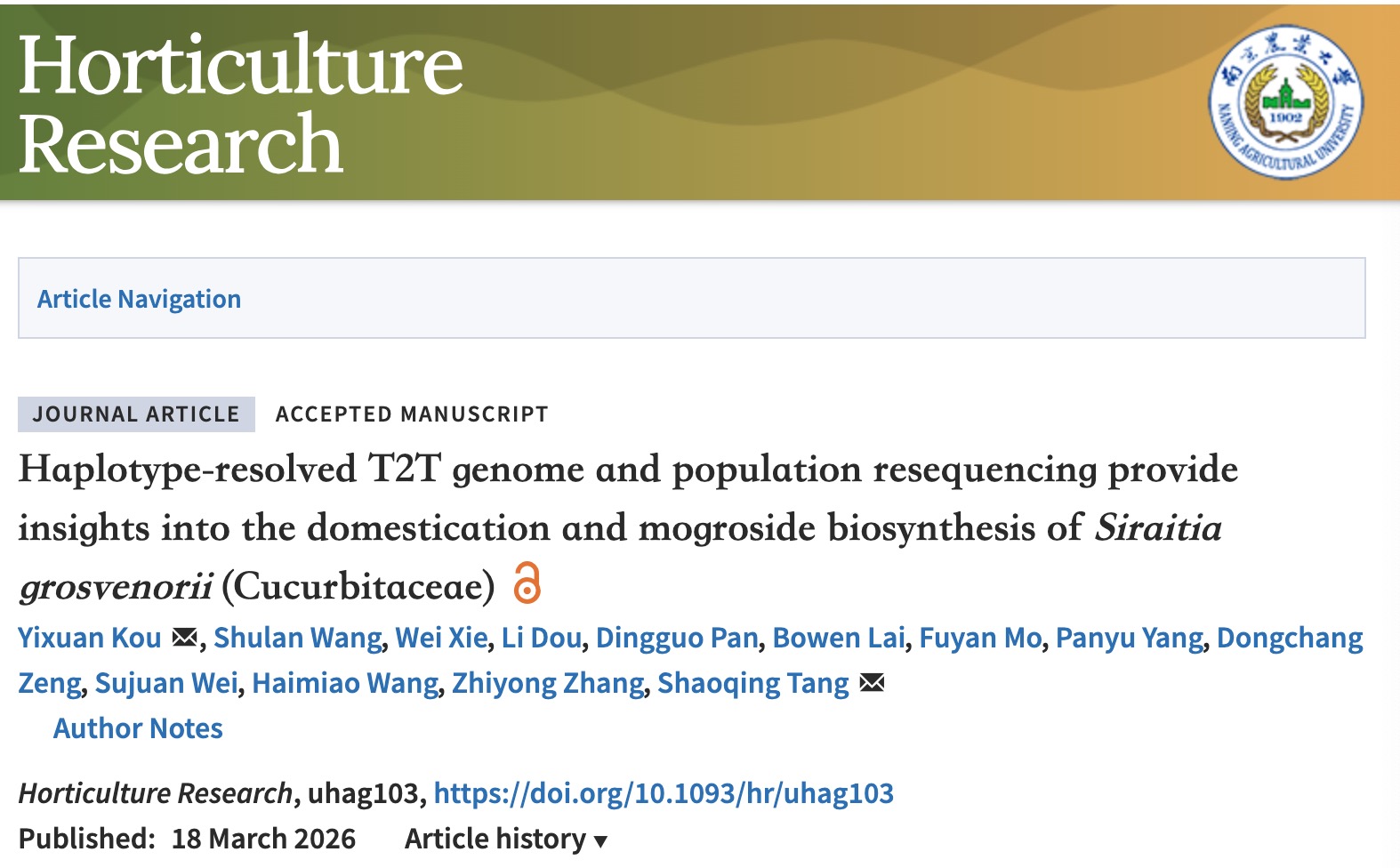 近日,广西漓江流域景观资源保育与可持续利用重点实验室寇一翾副研究员课题组在国际著名学术期刊《Horticulture Research》(园艺学科排名第一,中科院一区TOP期刊,五年影响因子9.1)发表题为“Haplotype-resolved T2T genome and population resequencing provide insights into the domestication and mogroside biosynthesis of Siraitia grosvenorii (Cucurbitaceae)”的论文。广西师范大学珍稀濒危动植物生态与环境保护教育部重点实验室、广西漓江流域景观资源保育与可持续利用重点实验室、特色经济作物生物信息与遗传改良广西高校工程研究中心为论文第一完成单位。