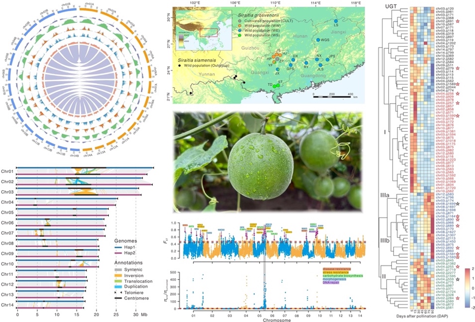 罗汉果(Siraitia grosvenorii)是葫芦科著名的药食两用植物,其果实富含的三萜糖苷类物质罗汉果甜苷V,是一种甜度约为蔗糖300倍的无热量天然甜味剂,同时罗汉果作为传统中药材,还具有抗氧化、抗炎、镇咳祛痰等多种药理活性,兼具经济价值与药用价值,在食品、医药领域应用广泛。然而,罗汉果的驯化起源尚不明确,甜苷生物合成的时空调控规律也有待深入解析,严重制约了其品种的遗传改良和产业升级。
