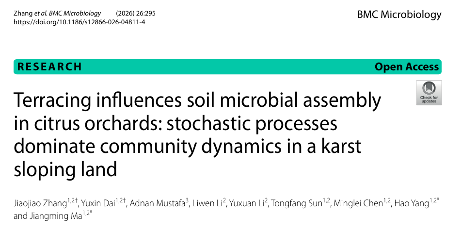 2026年3月31日,广西漓江流域景观资源保育与可持续利用重点实验室杨皓副教授课题组以题为“Terracing influences soil microbial assembly in citrus orchards: stochastic processes dominate community dynamics in a karst sloping land”的研究论文在《BMC Microbiology》(IF=4.5,2025中科院与2026新锐2区)在线发表。论文第一作者为课题组23级生态学硕士生张娇娇与22级生态学专业已毕业硕士戴雨昕(现为华东师范大学生态学博士),杨皓副教授和马姜明教授为论文共同通讯作者,捷克布尔诺理工大学助理教授Adnan Mustafa也参与了本次研究,研究得到广西重点研发计划(GUIKEAB22080071)和广西科技重大专项(AA20161002)的资助。