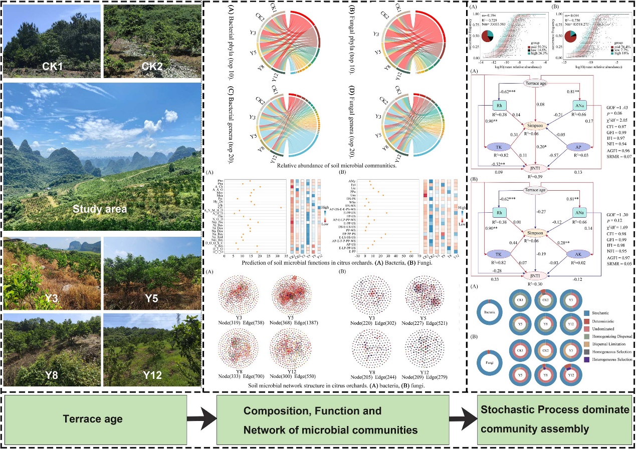 喀斯特地貌占我国西南地区总面积的三分之一,其土壤高异质性、水土流失严重的特点给农业生产带来巨大挑战。梯田作为该区域重要的水土保持和农业增产措施,已被广泛应用于柑橘等经济作物种植,但长期梯田种植如何影响土壤微生物群落结构与功能,尤其是确定性过程与随机性过程对微生物组装的相对贡献,此前尚未明确。