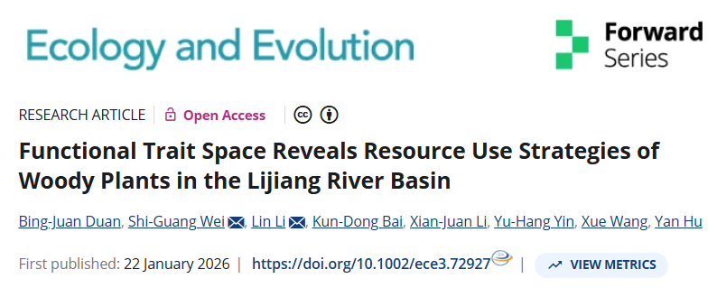 相关成果以“Functional Trait Space Reveals Resource Use Strategies of Woody Plants in the Lijiang River Basin”为题,于2026年1月22日正式发表于中科院二区期刊《Ecology and Evolution》。广西漓江流域景观资源保育与可持续利用重点实验室(以下简称“重点实验室”)2023级生态学硕士研究生段炳娟为论文第一作者,重点实验室魏识广教授与桂林电子科技大学李林教授为共同通讯作者,重点实验室白坤栋研究员、中国科学院华南植物园练琚愉研究员也参与了该研究工作。该研究获国家自然科学基金(32460270)、广西自然科学基金(2022GXNSFAA035583)共同资助。