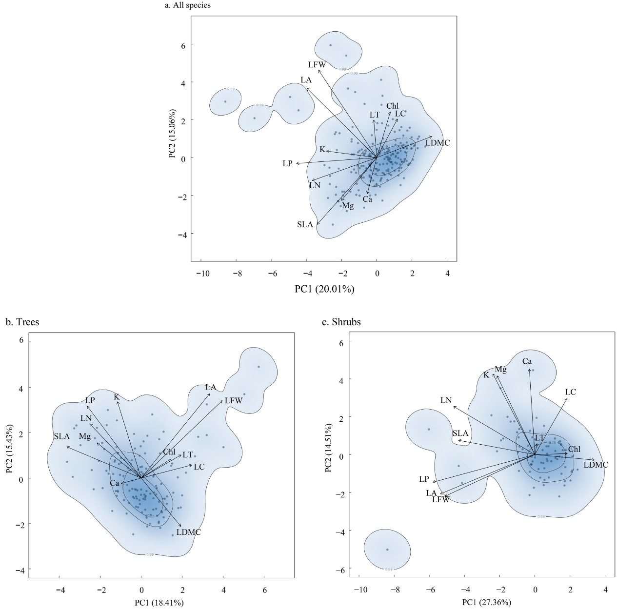 Fig.1 Two-dimensional projection of functional trait space for woody plant species in the Lijiang River Basin